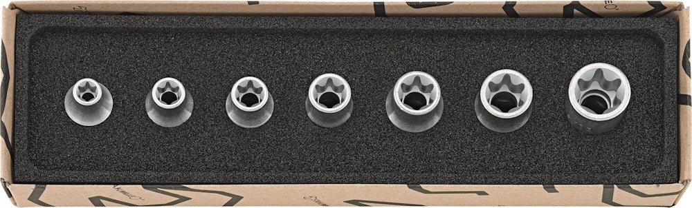Stahlwillen Saksassa valmistettu 7-osainen hylsyavainsarja 3/8"-vääntiöllä Torx-E -ruuveille. Taottu, karkaistu ja jäähdytetty öljyhauteessa HPQ® High Performance -laatu, kromiseosteräs, kromattu. Toimitetaan kartonkipakkauksessa.