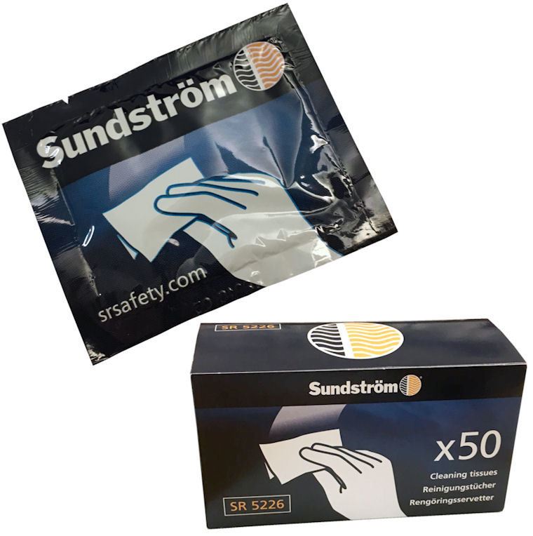 Yksittäispakatut puhdistuspyyhkeet hengityssuojainten, kuulonsuojainten sekä suojalasien päivittäiseen puhdistamiseen. Sisältää 70% etyylialkoholia. Pakkausessa 50 kpl.