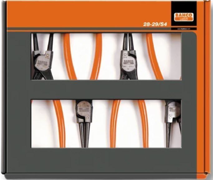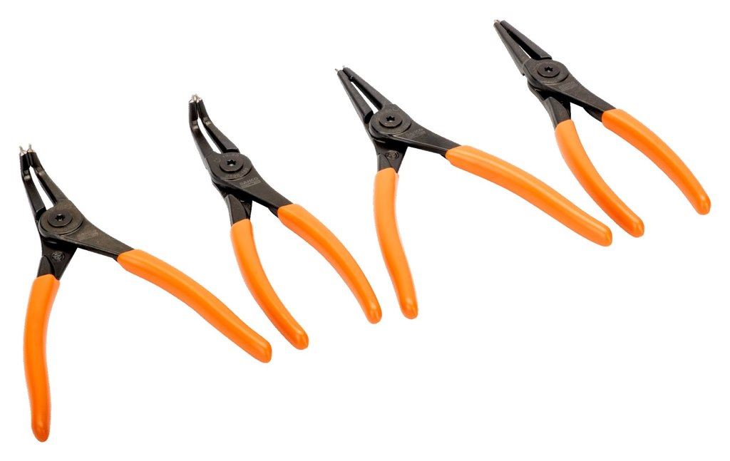 Bahcon lukkorengaspihtisarja, sisältää neljät pihdit erityyppisille lukkorenkaille. DIN 5256 A.